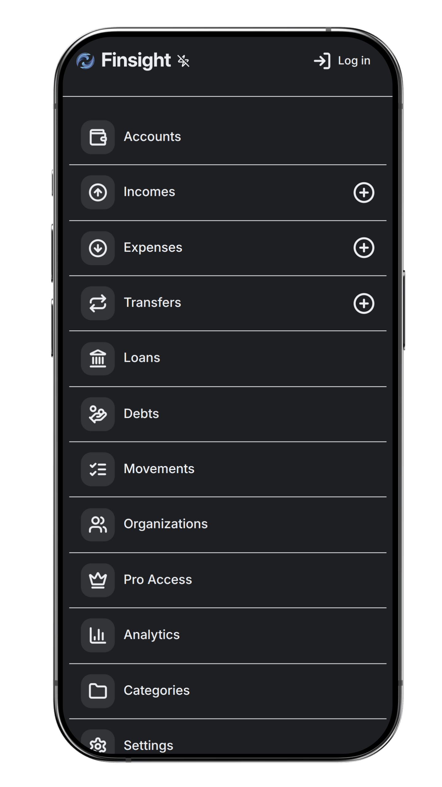 Finsight is an app for managing personal and organizational finances. It brings accounts, income, expenses, transfers, debts, credits, and analytics into one place.
